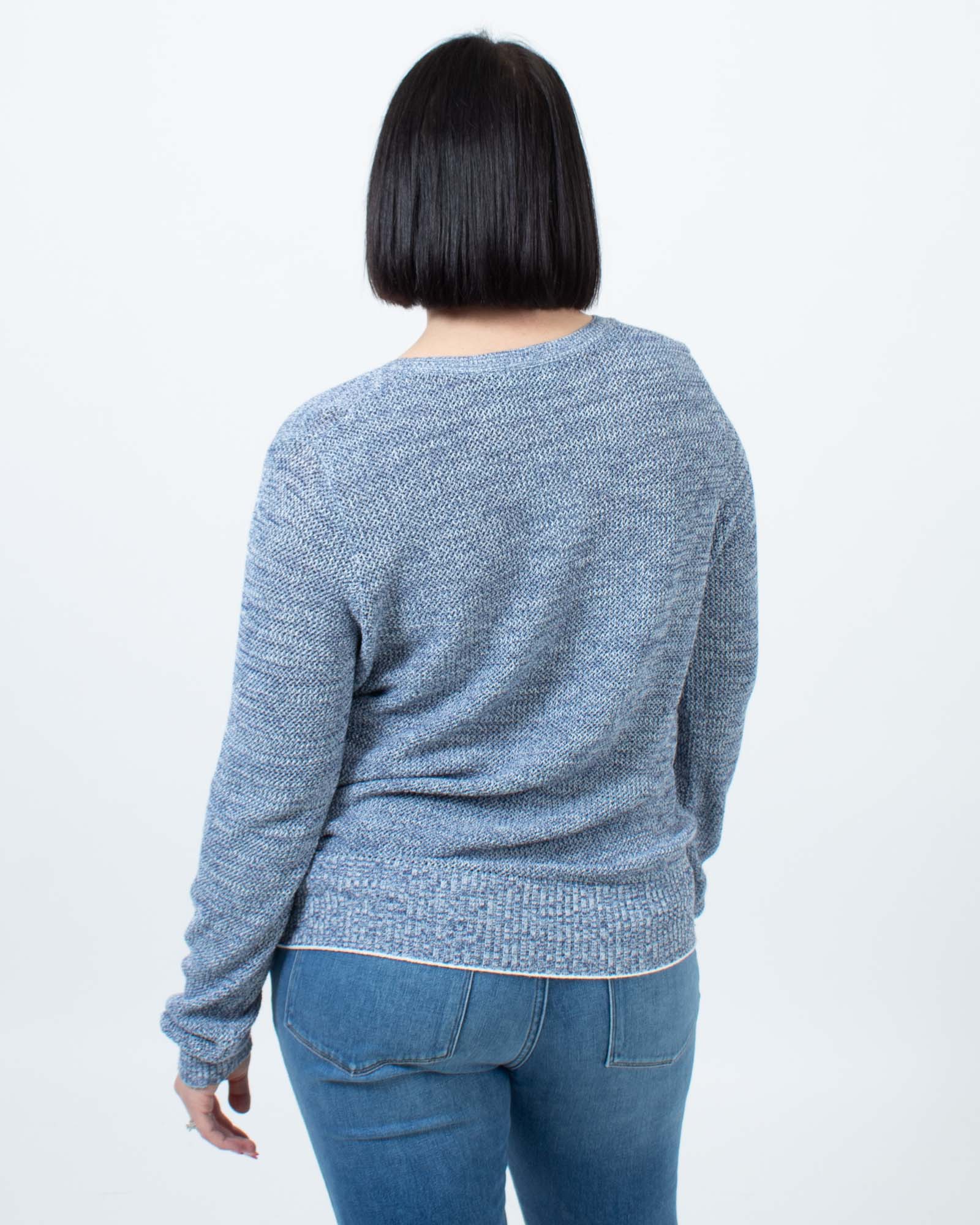 Theory open knit pullover sweater with a U-neckline, long sleeves, and ribbed lining at collar, wrists, and waist. Made of viscose and polyester.
